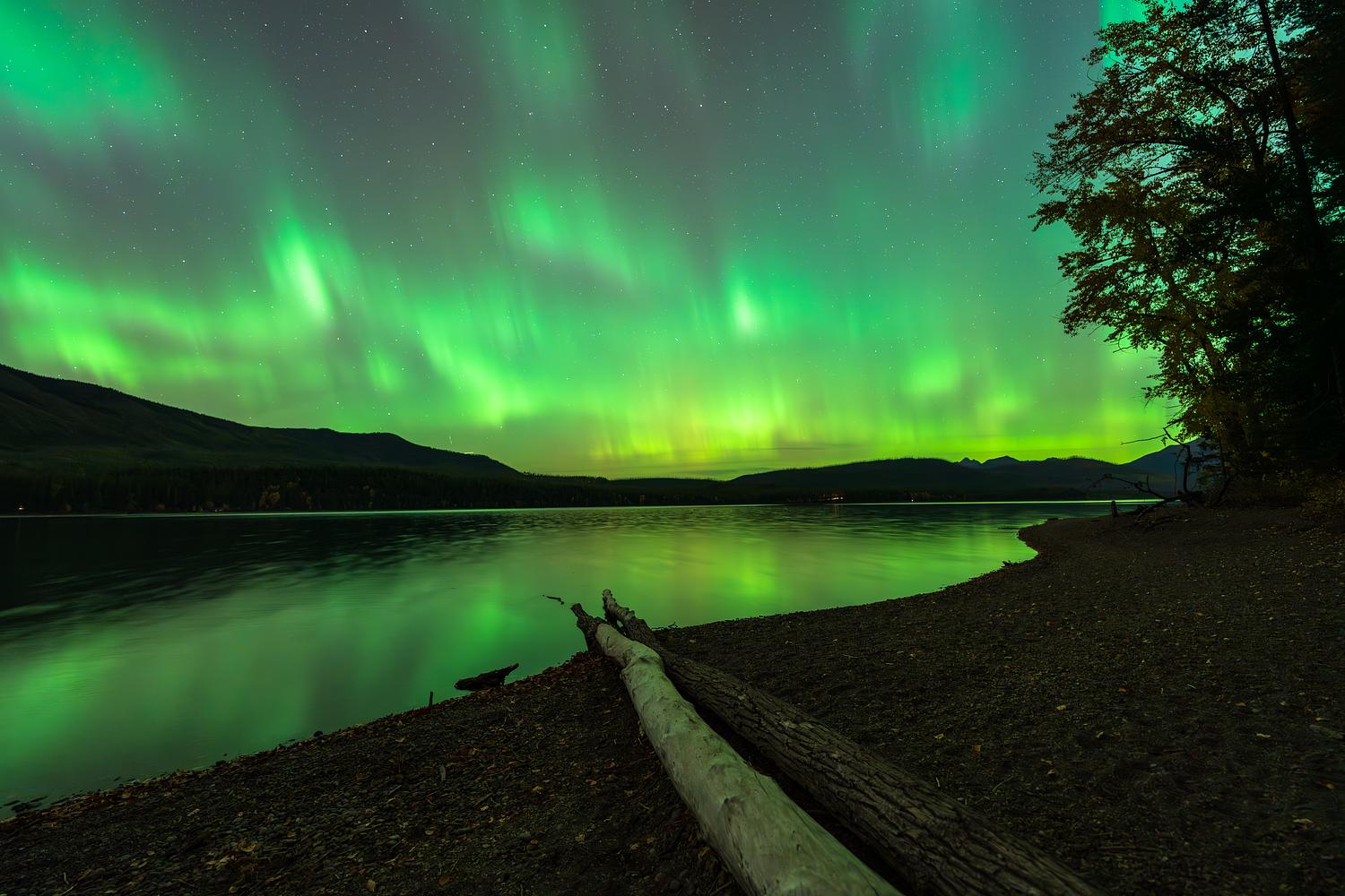 Aurora pulses and dances over Lake McDonald in Glacier National Park