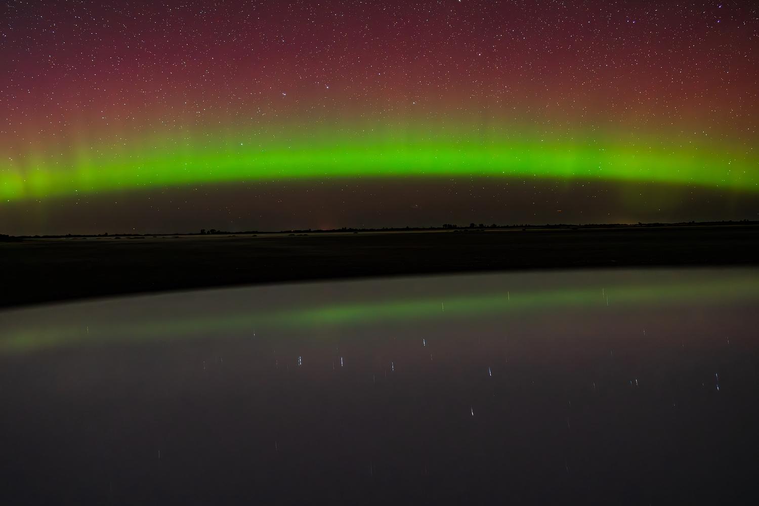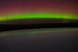 The iconic green arc of the Aurora Borealis is bright in the night sky over northern Minnesota, casting a reflection on one of the many lakes in the area