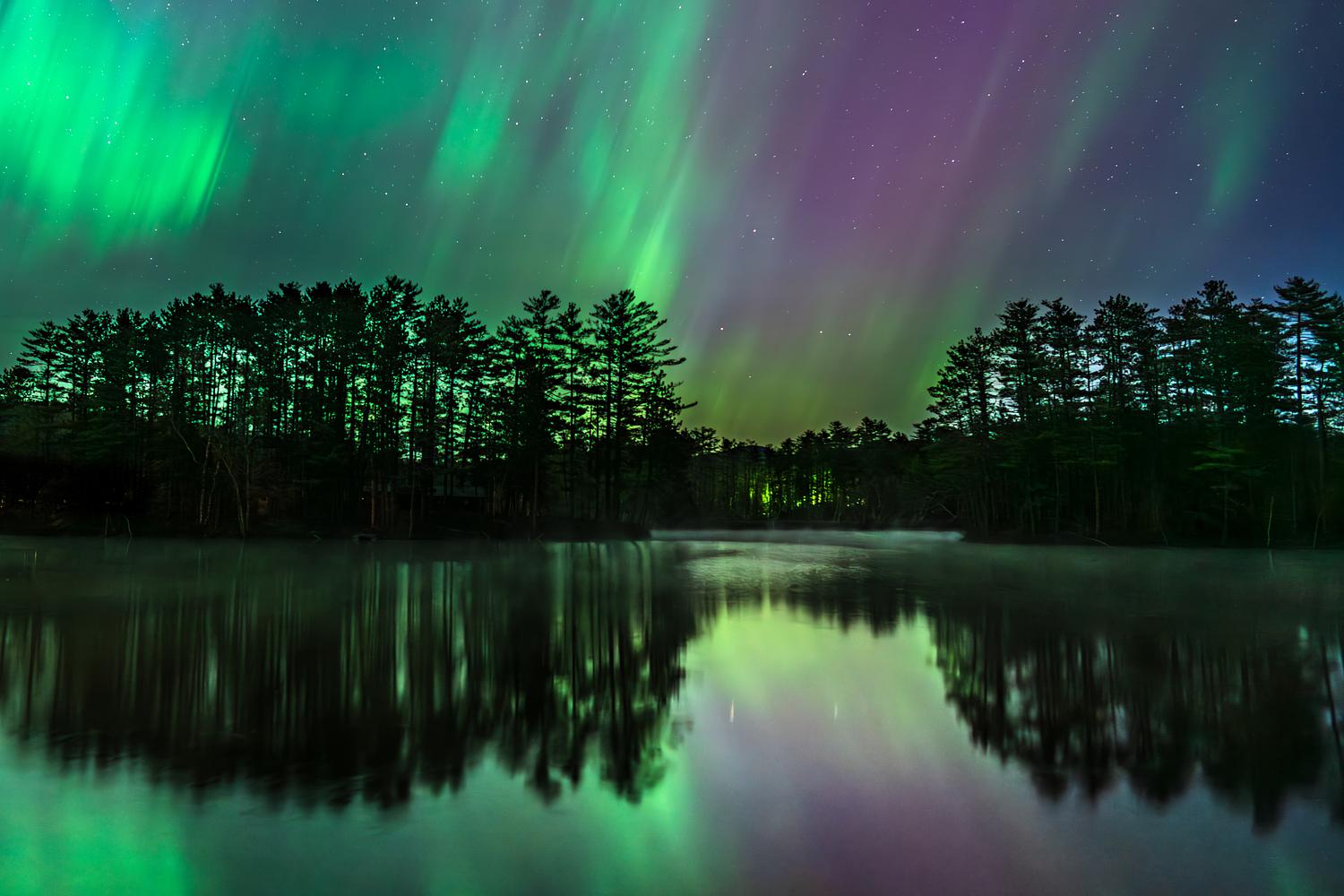 An incredible night in May 2024 as a super solar storm brought Aurora Borealis to many locations. This bucolic pond in Maine was a perfect setting for not only the reflection, but also the mist rising off the water and the many frogs chirping in the still night air.
