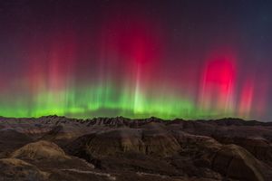 A beautiful Aurora over Badlands National Park dances in greens and reds over the Yellow Mounds area of the park during November 2025.
