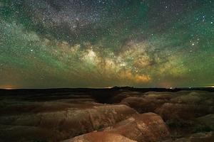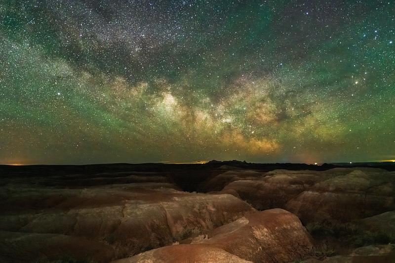 The night sky, and the galactic core of the Milky Way, shine ever-so-bright over Badlands National Park in South Dakota. The green tint or glow in the sky is caused by air glow - charged particles in the Earth's atmosphere, frequently seen in the warmer months in the night sky.