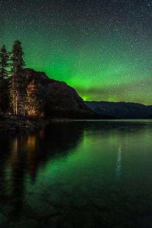 The Aurora Borealis shines bright in iconic green over Lake Minnawanka in Canada's Banff National Park, the still water of the lake creating a perfect setting for a reflection of the Northern Lights from the heavens above.