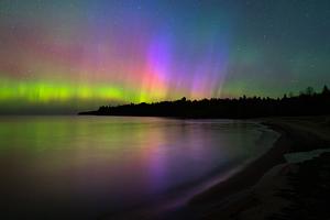A subtle, yet colorful pastel Aurora Borealis display shines over the beach at Cornucopia on Lake Superior in Wisconsin. This was part of an amazing all-night-long Northern Lights show, one of the biggest and best in the lower 48 U.S. in many years. The Aurora danced and moved and changed colors from sunset to sunrise this lonely late fall night.