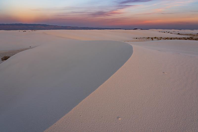 The amazing white dunes of White Sands National Park in New Mexico take on a special glow at sunset and the alpenglow of dusk, transformed into a magical never-ending sea of white and muted color as the day comes to a close