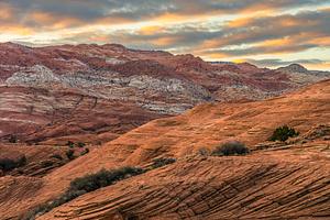 Layers of geological goodness converge under a sunset sky in Utah's Snow Canyon State Park. The orange rock formations in the foreground are actually petrified sand dunes.