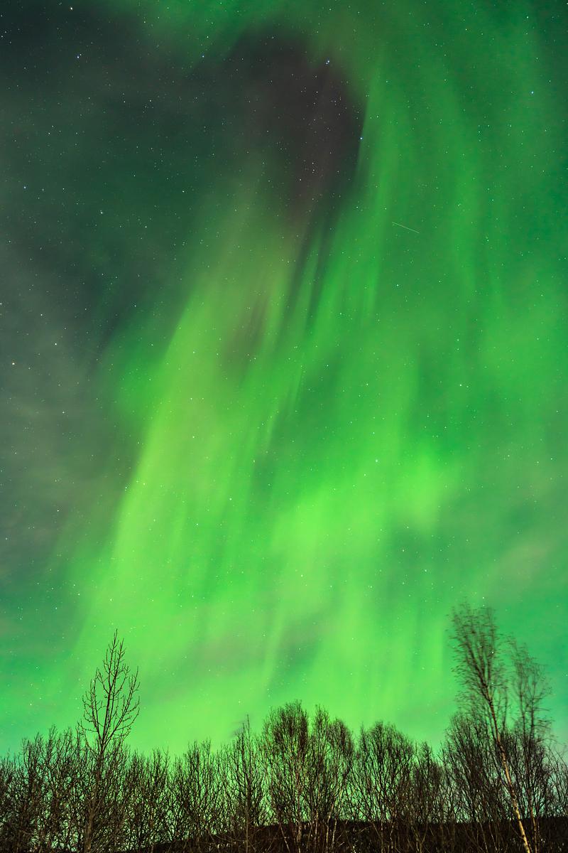 A giant Aurora Borealis rises in the interior of Alaska like a giant flame. The Northern Lights can be incredibly strong in Alaska and this night did not disappoint.